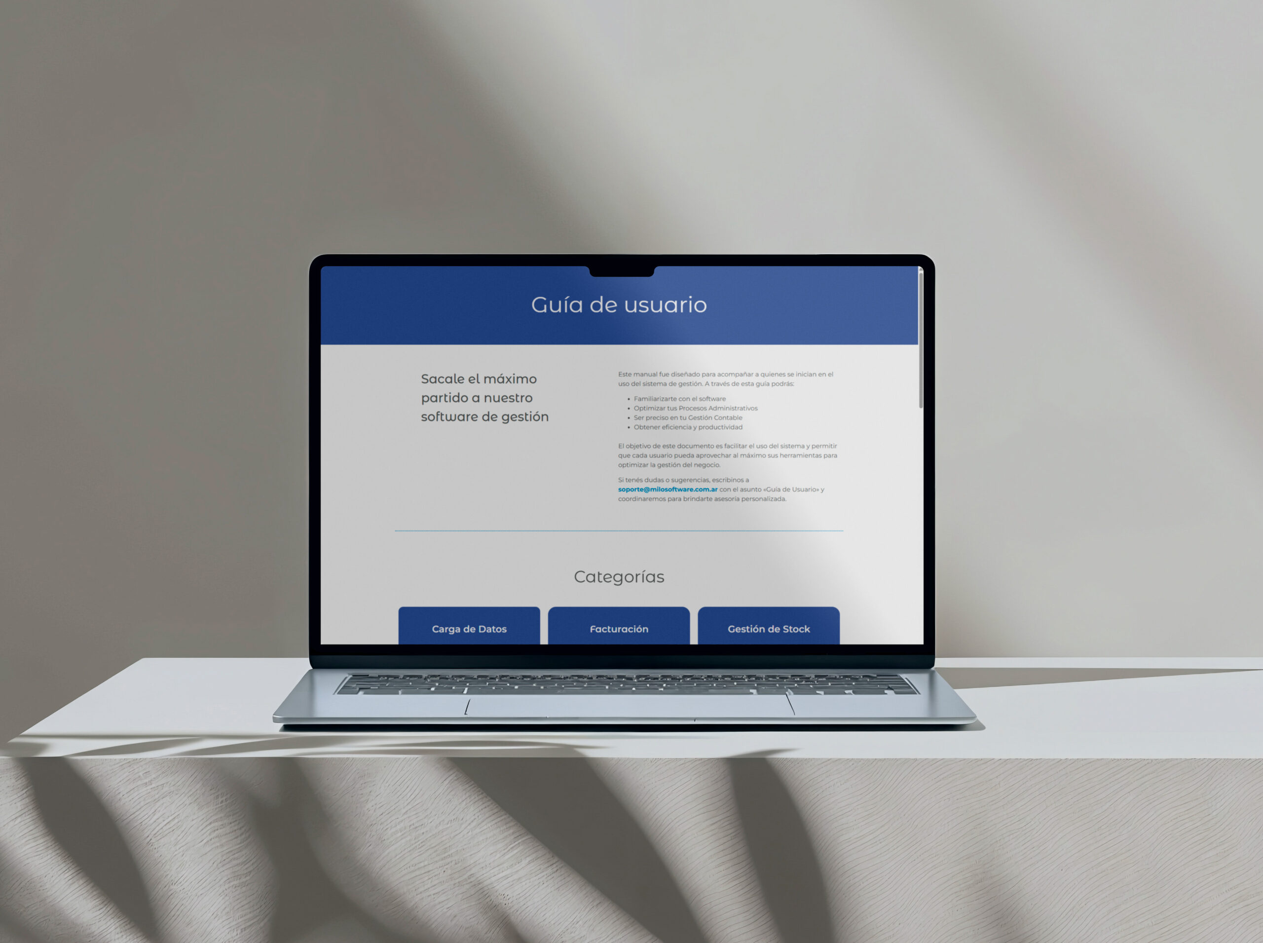 Desarrollamos la imagen de marca, papelería y web institucional para representar al sistema de gestión administrativa para medianas y pequeñas empresas de Mar del Plata y la zona. Al crecer la relación con el cliente y se nos solicitó una análisis heurístico del software y asesoramiento posterior para implementar cambios en su UI. Actualmente testeamos, mejoramos e iteramos las propuestas de cada pantalla.
